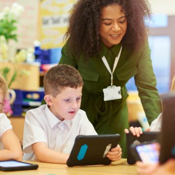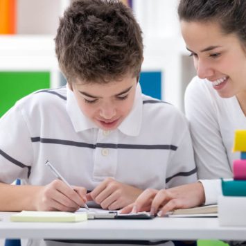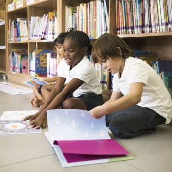 Boy peeking through gap in bookshelf