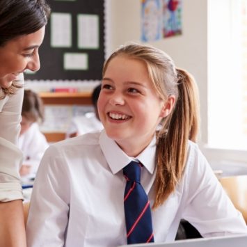 stylised illustration showing a male teacher adopting an inappropriately close stance beside a female student, representing sexual harassment in schools